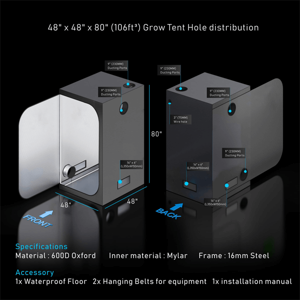 - Īpaši bieza Oxford auduma: izgatavots no augstas kvalitātes Oxford materiāla, kas ir izturīgs pret plīsumiem. Iekšējā daļa ir izgatavota no Mylar materiāla, kas palielina apgaismojuma efektivitāti audzēšanas teltīs. Jāatzīmē arī, ka telšu virsmas ir izgatavotas no videi draudzīgiem, netoksiskiem un bez smaržas materiāliem.