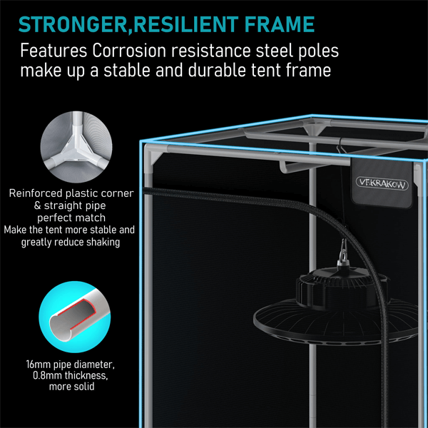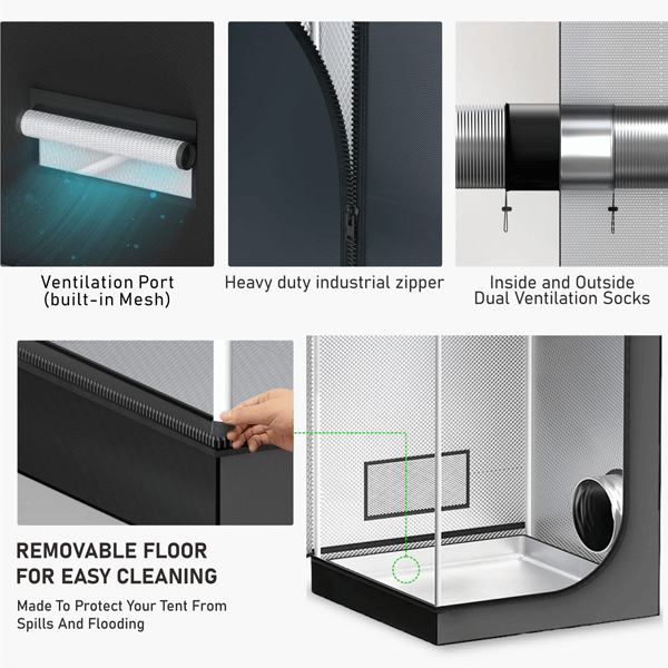 - Īpaši bieza Oxford auduma: izgatavots no augstas kvalitātes Oxford materiāla, kas ir izturīgs pret plīsumiem. Iekšējā daļa ir izgatavota no Mylar materiāla, kas palielina apgaismojuma efektivitāti audzēšanas teltīs. Jāatzīmē arī, ka telšu virsmas ir izgatavotas no videi draudzīgiem, netoksiskiem un bez smaržas materiāliem.